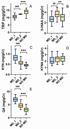 Urinary levels of tryptophan (TRP) (A), 5-hydroxyaminoacetic acid (5-HIAA) (B), kynurenine (KYN) (C), kynurenic acid (KYNA) (D), and quinolinic acid (QA) (E) expressed in milligram per gram of creatinine (mg/g Cr), in elderly individuals with mood disorders before (MD_1) and after (MD_2) a 12 week dietary intervention with TRP as well as elderly subjects without mood disorders (NO MD). Median with boxes represent I and III quartiles, and error bars represent 1.5 times the interquartile distance. The Wilcoxon matched-pairs signed-rank test was used to compare before–after groups (denoted as #), otherwise U Mann–Whitney test was used to analyze differences within two groups (denoted as *); n = 40 in NO MD and n = 38 in MD-1 and MD-2; **—p < 0.01; ***—p < 0.001; ##—p < 0.01, ###—p < 0.001.