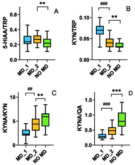 Ratios of urinary levels of 5-hydroxyaminoacetic acid (5-HIAA) (A) and kynurenine (KYN) (B) to tryptophan (TRP), as well as kynurenic acid (KYNA) to KYN (C) and quinolinic acid (QA) (D) expressed in milligram per gram of creatinine (mg/g Cr), in elderly individuals with mood disorders before (MD_1) and after (MD_2) a 12 week dietary intervention with tryptophan as well as elderly subjects without mood disorders (NO MD). Median with boxes represent I and III quartiles, and error bars represent 1.5 times the interquartile distance. The Wilcoxon matched-pairs signed-rank test was used to compare before–after groups (denoted as #), otherwise U Mann–Whitney test was used to analyze differences within two groups (denoted as *); n = 38 in the MD groups and n = 40 in NO MD group; **—p < 0.01; ***—p < 0.001; ##—p < 0.01, ###—p < 0.001.