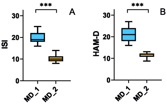 Effect of a 12-week dietary intervention with tryptophan on the sleep disturbances measured with Insomnia Severity Index (ISI, (A)) and level of depression measured with Hamilton Depression Rating Scale (HAM-D, (B)) in elderly individuals with mood disorders before (MD_1) and after (MD_2) the intervention. Median with boxes representing I and III quartiles, error bars represent 1.5 times the interquartile distance. The Wilcoxon matched-pairs signed-rank test was used to compare before–after groups; n = 40 for MD_1 and n = 38 for MD_2; ***—p < 0.001.