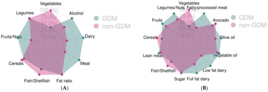 The food groups for each of the scores used were also compared (Table 2 and Table 3). We observed statistically significant differences for the “meat and derivatives” food group from the MDS index by Trichopoulou et al. (p = 0.008) as shown in Table 2. When the modified version of the MDS index by Leighton et al. was used, a significant difference in the “fatty meat and processed meat” food group (Table 3) was observed, with consumption being higher in both cases in the GDM group. No other significant differences were found for the any of the remaining food groups in either score. These differences can be also seen in Figure 1A,B.