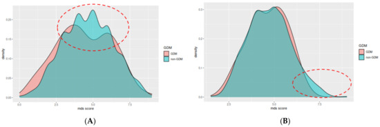 A score of 5–9 points using the MDS index is associated with 43% lower likelihood of GDM (aOR: 0.57 [95% CI: 0.32, 0.9], p = 0.02) (Table 4). Using the modified version of MDS index, we did not observe statistically significant results for any level of adherence (Table 5). Additionally, the overall adherence for each group is shown in Figure 2A,B, where the differences in the adherence scores between the two groups are highlighted in red dotted ellipsoids.