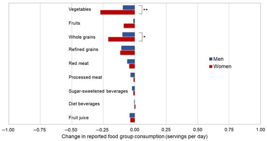 The change in diet quality score was statistically significantly different between males and females (Pinteraction = 0.001), with improved average scores among males (0.45 points, p < 0.001) but not among females (0.07 points, p = 0.32). Females had a greater decreased intake of vegetables (−0.27 servings/day, p < 0.001; Pinteraction < 0.001 by sex) and whole grains (−0.21 servings/day, p < 0.001; Pinteraction = 0.01 by sex) compared to males, but changes in other food groups did not statistically significantly differ by sex (Figure 1 and Table S2). Change in diet quality score and component food groups did not vary by age (<60 and ≥60 years), education (<4-year college, college graduate, and graduate school), or income (<$50,000; $50,000–$99,999; $100,000–$149,999; and ≥$150,000) in this younger, mostly educated and employed population (data not shown).