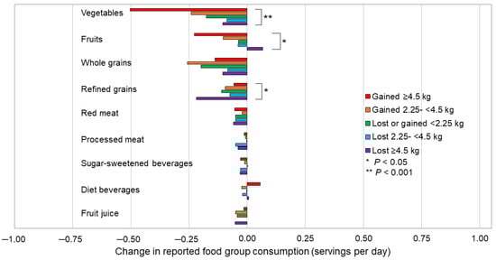 Change in diet quality score from 2018 to 2020 significantly varied by categories of weight change (p < 0.001; Table S4). Overall, participants who gained at least 2.25 kg had a decline in diet quality score, though the change was statistically significant only among participants who gained ≥4.5 kg (−0.40, p = 0.01). While all groups decreased consumption of vegetables, only participants who experienced minimal weight change (lost or gained <2.25 kg) or gained at least 2.25 kg significantly decreased intake (Figure 2 and Table S4). Change in fruit intake also significantly differed across weight change groups, with only participants who lost ≥4.5 kg reporting increased intake (0.07 servings/day, p = 0.27). All groups also decreased consumption of refined grains, but the greatest decline was reported among participants who lost ≥4.5 kg (−0.22 servings/day, p < 0.0001).