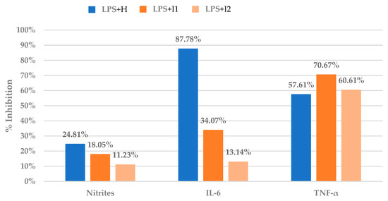 Results of anti-inflammatory assay on a macrophage cell line (RAW 264.7) of two treatment concentrations (LPS + I1 and LPS + I2; see Section 2.3). Results are calculated as percentage of inhibition of mediators’ release against sample LPS. The positive control is LPS + H.