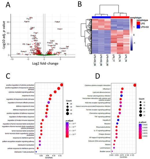 The DESeq2 R software package (version 3.14) [18] was used to perform differential expression analysis between the two groups, LPS + I1 vs. LPS. The transcript-level count abundances from Salmon were summarized at the gene level and imported to R using the tximport v1.22.0 package [19]. Gene symbols were linked to Ensembl (release 99) biotype annotations for the Mus musculus reference genome GRCm39 using the AnnotationHub R package (v.2.2.2) [20]. Differentially expressed genes (DEGs) were identified based on an absolute fold change (FC) value > 1.2 and a Benjamini–Hochberg adjusted p-value < 0.05. The ‘apeglm’ method was used for log2 FC shrinkage.