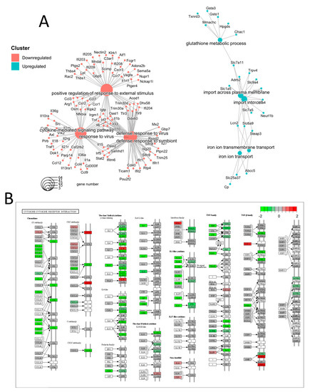 Transcriptomics showed an intense downregulation of cytokine production and regulation processes. (A) Category net plot of GO terms enriched for over− and underexpressed genes separately. (B) Cytokine–cytokine receptor interaction pathway showing integrated transcriptomics data. Genes overexpressed (in red) or underexpressed (green) according to the transcriptomic analysis are highlighted.