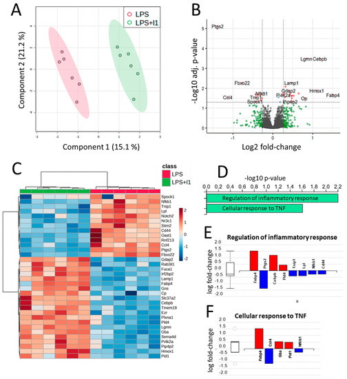 Overview of proteomic analysis results. (A) Partial least squares discriminant analysis (PLSDA) two-component score plot including all 6065 considered quantified proteins. Bioreplicates from both experimental groups are clearly separated. (B) Volcano plot showing proteins with differential expression in LPS-activated RAW 264.7 as a result of inulin treatment. Dotted lines show adjusted p-values < 0.05 and 1.2 fold-change cutoffs; proteins above both thresholds are shown in red. (C) Heatmap showing the unsupervised clustering of the 12 analyzed bioreplicates using the 34 proteins with differential expression as measured by diaPASEF LC-MS. Samples from the LPS + I1 and reference (LPS) groups are shown in green and red, respectively. (D) GO analysis showing significant (adjusted p-values < 0.05) biological processes. Gene perturbation bar plots for the affected proteins within biological processes, (E) regulation of inflammatory response, and (F) cellular response to tumor necrosis factor (TNF). Overexpressed proteins are shown in red, and under-expressed proteins are shown in blue.