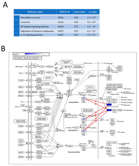 Regarding the functional analysis of proteomics data, two GO terms were found to be statistically significant using iPathwayGuide’s ‘smallest common denominator’ algorithm (Figure 4D–F). To determine the biological pathways in which the 34 identified DEPs are involved, pathway impact analysis was performed using iPathwayGuide. This tool employs an impact analysis approach that takes into account not only the over-representation of DEPs in a given pathway (i.e., enrichment analysis) but also topological information, such as the direction and type of all signals in a pathway, as well as the position, function, and type of each protein [32]. The top five pathways are shown in Figure 5A,B, including the NF-κB signaling pathway, highlighting regulated proteins as identified by our proteomic analysis.