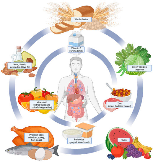 The immune system is the body’s central defense network against infection and disease. The immunological responses to antigens or foreign molecules, such as viruses, involve the innate and adaptive immune cells [37]. Innate immunity is the body’s general first line of defense against pathogens. It includes physical barriers, such as the skin and mucous membranes, as well as chemical defenses, including acids and enzymes. Innate immunity also includes cells, such as natural killer cells, which can recognize and destroy pathogens. Adaptive immunity is the body’s second line of defense. It develops after exposure to a pathogen and confers long-lasting protection against that specific pathogen. Adaptive immunity is mediated primarily by B- and T-cells, which produce antibodies that bind to and neutralize pathogens. Innate and adaptive immunity are supported by dietary factors such as micronutrients and minerals. Adequate dietary intake of the micronutrients and minerals is achievable through consuming a healthy diet in accordance with national dietary guidelines [24]. However, supplementation may provide additional benefit to the immune system or combat viral infections and thus are implicated in COVID-19 and PASC therapy. Dietary factors of interest include vitamins C and D, zinc, iron, and probiotics and are discussed in further detail below.