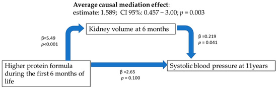 In our cohort, at 11 years of age, protein ingestion during the first year of life did not have a significant effect on BMI at 11 years in the multivariate analysis, so BMI cannot be considered a mediator of the effect of early protein ingestion on blood pressure at 11 years. Kidney volume at 6 months of age was significantly associated with protein ingestion during the first year of life. In the mediation analysis, the protein supply had a statistically significant indirect effect on SBP at 11 years, partially mediated by kidney volume at 6 months (Figure 2).