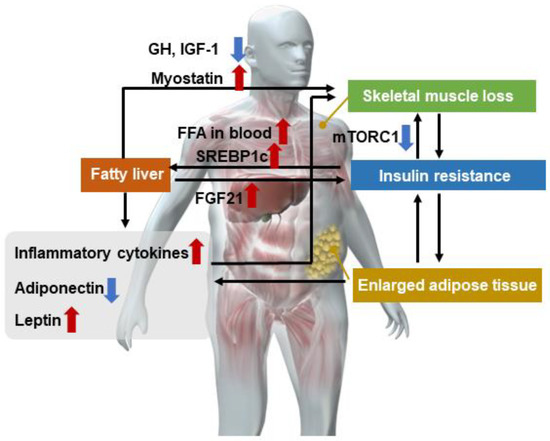 In NAFLD/NASH, adipose tissue macrophages secrete inflammatory cytokines such as tumor necrosis factor-α (TNF-α), transforming growth factor-β (TGF-β), and interleukin-1 and -6 [2,51,52,53]. These cytokines promote protein decay in skeletal muscle [2,51,54]. In addition, growth hormone (GH) and insulin growth factor-1 (IGF-1) may be decreased in NAFLD/NASH, which may contribute to the progression of sarcopenia, since IGF-1 produced in the liver has a muscle-retaining effect [55].