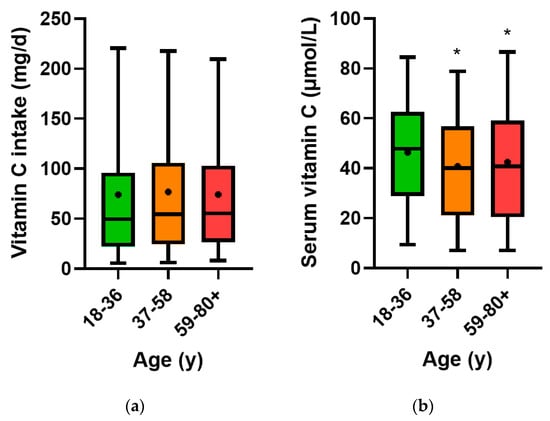 Dietary vitamin C intake (a) and circulating vitamin C concentrations (b) relative to age tertile. Age group: 18–36 (n = 942), 37–58 (n = 942) and 59–80+ (n = 944). Bars represent median with 25th and 75th percentiles as boundaries, whiskers represent 5th and 95th percentiles and symbols represent means. * p < 0.0001 relative to younger age group.