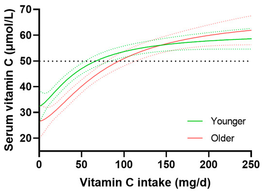Circulating vitamin C concentrations relative to daily intake in the younger and older age groups. Younger age tertile of 18–36 y (n = 942) vs. older age tertile of 59–80+ y (n = 944). Sigmoidal (four parameter logistic) curves were fitted to the dose–concentration data with asymmetrical 95% confidence intervals indicated. Dashed line indicates 50 µmol/L serum vitamin C, which is considered ‘adequate’.