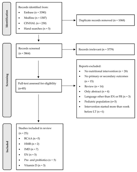 A literature search was carried out using Medline, Embase, and CINHAL complete to identify all nutritional intervention studies from inception to September 2022. Google Scholar was also used to identify additional articles by hand searching. The strategy utilized a combination of keywords and controlled vocabulary combining terms and synonyms related to post-LT AND nutrition intervention AND at least one of these outcomes: malnutrition or sarcopenia or infections or hospital LOS or ACR or mortality. The detailed strategy is as follows: “liver transplant” or “post-liver transplant*” or “hepatic transplant*” or “liver graft*” AND “after” or “preoperative” or “post*” or “following” or “postoperative” or “peri-operative” AND “BCAA” or “nutrition* intervention” or “branched-chain amino acids” or “beta-hydroxy, beta methylbutyrate” or “HMB” or “Beta hydroxy beta methylbutyrate” or “hydrolyzed whey peptide” or “immune*” or “immune* modulating” or “enteral nutrition” or “parenteral nutrition” or “probiotic*” or “prebiotic*” or “Synbiotic*” or “vitamin d” or “vitamin d3” or “cholecalciferol” or “supplement*” or “diet” or “ω-3 polyunsaturated fatty acids” or “omega-3 fatty acids” or “omega 3” or “fish oil” or “n-3” or “eicosapentaenoic” or “docosahexaenoic” or “glutamine” or “arginine” or “ribonucleic acids” or “immunonutrition” AND “malnutrition” or “nutritional deficiency” or “nutrients” or “nutritional markers” or “intake” or “sarcopenia” or “muscle mass” or “muscle function” or “muscle” or “muscle performance” or “physical performance” or “body composition” or “infections” or “infectiou*” or “hospital stay” or “length of hospital stay” or “hospital*” or “acute cellular rejection*” or “rejection*” or “mortality” or “survival rate”.