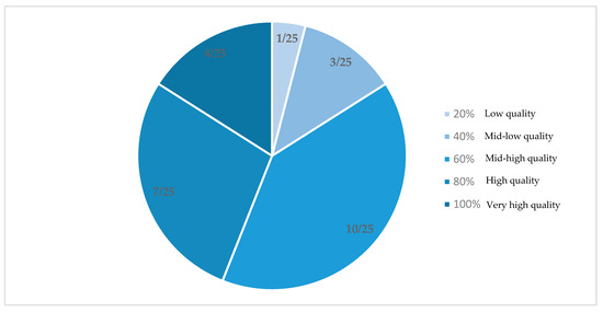 All studies underwent a quality assessment based on the MMAT. The results of these analyzes were presented in the 6 tables of each type of intervention and in Figure 2. The studies included in the review were mostly of mid-high quality, with a rating of 60% (10 articles). Only one study received a rating of 20% (low quality), three received a rating of 40% (mid-low quality), seven received a rating of 80% (high quality) whereas four were rated 100% (very high quality).