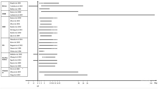 Duration of nutritional interventions studies after LT of included studies. Dotted lines at the beginning or at the end of the intervention indicates that the duration of the intervention differs between patients in the same study. * Duration varies between participants [39,40,41,46,51,57,61,64,65,66,67,69,70,71,74,75,76,84,87,88,89,90,91,100,101].