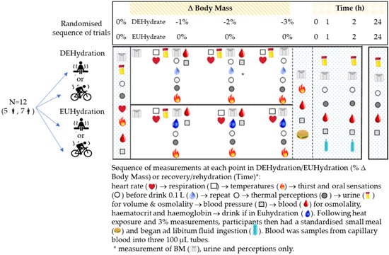 Trials were separated by at least 1 week for males and by 1–2 or 4 weeks for females (days 16–24, during the self-reported, estimated luteal phase) to minimise the effects of the menstrual phase on fluid regulation []. Each participant completed trials at the same time of day to standardise core temperature []. Participants were instructed to drink 8 mL/kg and 5 mL/kg of water with dinner and after waking, respectively, to standardise their hydration status prior to each trial. Participants fasted for 12 h before each trial and recorded their food and fluid intake 24 h prior to each trial. Participants were asked to refrain from drinking caffeine or alcohol within 12 h of each trial. They were further requested to undertake no more than 1–2, 1 and 0.5 h of physical activity for 3, 2 and 1 day/s, respectively, prior to each trial, and limit physical activity until after the 24-h follow up measures. Measurements were collected at the times and hydration levels shown in Figure 1, and as described in Section 2.6. Participants were informed about the aim of the study but were blinded to the hypotheses being tested.