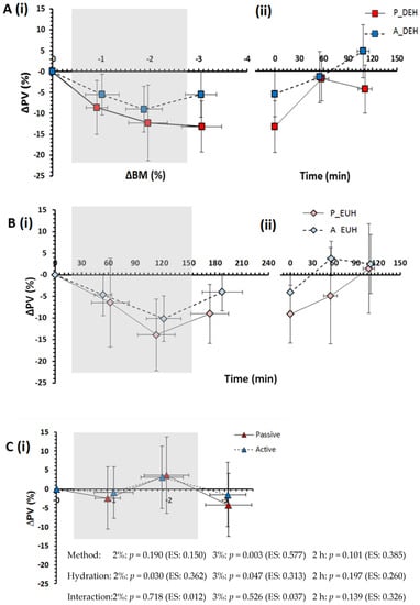 Change in plasma volume (∆PV) during (i) passive DEHydration (Grey area: 40 °C, 60% RH; White area: 25 °C, 35% RH) and active DEHydration (4 min at ~90% HRmax) in a temperate environment (Grey area: 29.5 °C, 50% RH; White area: 24 °C, 33% RH) to 3% ∆BM with (A) no fluid (p_DEH; A_DEH); (B) fluid intake matched to replace ∆BM (P_EUH;A_EUH) (C) controlling for hydration status (passive; active); and (ii) over a 2-h rehydration period following passive and active DEHydration when drinking water and sports drink ad libitum. Data are Mean ± SD for N = 12. ANOVA outcomes for relevant research questions are shown in the bottom panel, including effect size (ES: partial eta, η2).