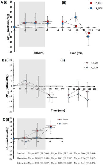 Change in plasma osmolality (∆Posm) during (i) passive DEHydration (Grey area: 40 °C, 60% RH; White area: 25 °C, 35% RH) and active DEHydration (4 min bouts at ~90% HRmax) in a temperate environment (Grey area: 29.5 °C, 50% RH; White area: 24 °C, 33% RH) to 3% ∆BM with (A) no fluid (P_DEH;A_DEH); (B) fluid intake matched to replace ∆BM (P_EUH;A_EUH) (C) controlling for hydration status (passive; active); and (ii) over a 2-h rehydration period following passive and active DEHydration when drinking water and sports drink ad libitum. Data are Mean ± SD for N = 12. ANOVA outcomes for relevant research questions are shown in the bottom panel, including effect size (ES: partial eta, η2).