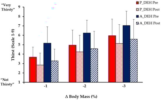 Pre- and post-thirst ratings following ingestion of a standardised small volume of water (0.1% ΔBM) at each of 1, 2, and 3% reductions in body mass during passive DEHydration (p_DEH: 40 °C, 60% RH,) and active DEHydration (A_DEH: 4-min bouts at ~90% HRmax in a temperate environment; 29.5 °C, 50% RH). Data are mean ± SD for N = 12.