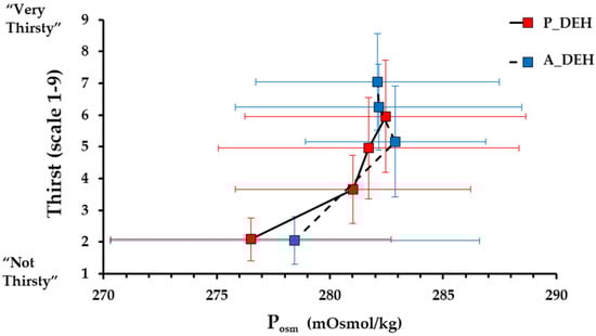 From baseline to 3% ∆BM, thirst increased by 3.9 ± 1.9 points for passive DEHydration and by 5.0 ± 1.6 points for active DEHydration (p < 0.001) but was not significantly higher for active than passive DEHydration (p = 0.161; Figure 5). Mean thirst was strongly correlated with mean ∆BM, mean ∆Posm and mean ∆PV for passive DEHydration (r = 0.980, 0.867 and 0.926, respectively) and for active DEHydration (r = 0.882, 0.744, and 0.712, respectively). The close relation of thirst to Posm was not influenced by the method of dehydration across the range 0 to −3% ∆BM (Figure 6).
