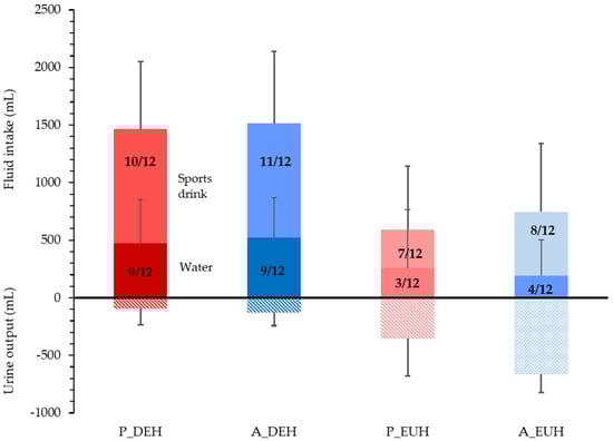 Two-hour fluid balance following passive heat-stress DEHydration (40 °C, 60% RH, P_DEH) and active heat-stress DEHydration (4-min exercise bouts at ~90% HRmax in a temperate environment, 29.5 °C, 50% RH, A_DEH). Data are mean for N = 12, with the inset fluid intake bars representing water intake, and the overlaid numbers representing the number of participants ingesting that beverage type.