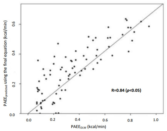 Figure 1 presents the association between the PAEE estimated using the final prediction equation with the PAEEDLW. A significant correlation was observed between the estimated and measured PAEE (p < 0.05).