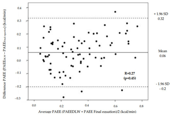 The final prediction equation was constructed after combining the validation and cross-validation groups (n = 79) and the PRESS (predicted residual error sum of squares) statistical method was used to validate the equation [27,28]. The degree of agreement between the PAEE from the new prediction equation (PAEEPredicted) and PAEEDLW was assessed by the Bland–Altman approach of assessing agreement between methods [29] with the differences between the PAEEDLW and PAEEPredicted (y-axis) plotted against the average of PAEEDLW and PAEEPredicted (x-axis). The level of statistical significance was set at p < 0.05, for all tests.