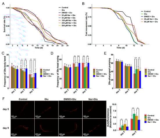 We first investigated the beneficial effects of Nar on HGI C. elegans. Gradient concentrations of 25, 50, 100, 200 and 500 μM Nar were tested to find the optimum. The addition of 25 μM Nar prolonged the mean lifespan of C. elegans most strongly (Figure 1A), increasing mean lifespan by approximately 24% compared to the DMSO group (Table 1). This dose–response effect is consistent with tomatidine [41] and shatavarin IV [42], whereby the lifespan-prolonging effect disappeared at higher concentrations. Moreover, 50 μM Nar extends the lifespan of worms under normal conditions [23], indicating that a lower dose of Nar could prolong the lifespan under a high-glucose condition, which suggests that there are other mechanisms that remain to be explored. The 25 μM Nar also improved aging-related phenotypes. The mean fast movement span was extended by approximately 11%, (Figure 1B and Table 2) suggesting that HGI worms tended to be healthier. Thus, 25 μM Nar was used for all subsequent experiments. The frequency of body bends and head swings in HGI worms with Nar was significantly increased on days 5 and 9 compared to the control (Figure 1C,D). We then explored whether longevity is mediated by dietary restriction-like effects by recording the frequency of the pharyngeal pump. No significant difference in pharyngeal pump frequency was seen in Nar-fed nematodes at days 2 and 5, but at 9 d, pharyngeal pump frequency significantly decreased in Nar-fed nematodes (Figure 1E), indicating that Nar may not prolong lifespan through dietary restriction-like effects during the early stage of the nematode lifespan. Moreover, autofluorescence in HGI worms fed with Nar was significantly lower compared to those without Nar on days 5 and 9 (Figure 1F). These results suggest Nar has anti-aging effects on HGI worms.