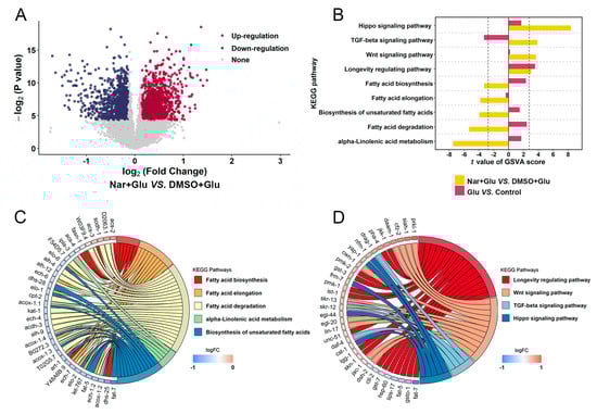 Bioinformatic analysis for whole transcriptome sequencing. (A) Volcano plot showing differentially expressed genes between “DMSO + Glu” and “Nar + Glu” groups. (B) Nine significantly different pathways screened by GSVA. (C) The specific genes in upregulated and (D) downregulated pathways from the nine pathways in (B).