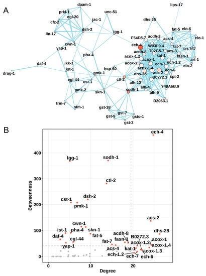 A total of 2603 mRNAs (Figure 2A), 4 lncRNAs (Figure S1A), 2 circRNAs (Figure S1B), and 32 miRNAs (Figure S1C) were differentially expressed between the HGI worms with and without 25μM Nar. Based on 126 KEGG pathways, the gene set variation analysis (GSVA) algorithm revealed 48 notable changes in the pathway expression levels when HGI worms were treated with Nar (Figure S2)—the t-value and the specific genes in these 48 pathways are listed in Table S2. Then, nine signaling pathways related to the study purpose were screened (Figure 2B). For example, fat metabolism-related pathways were downregulated, while Wnt and TGF-β, as well as longevity signaling pathways, were upregulated. The differentially expressed genes in these pathways are displayed in Figure 2C,D and Table S3. To identify appropriate genes for subsequent analysis, a protein–protein interaction (PPI) network analysis was performed on these genes (Figure 3A). Key genes with betweenness > 41 and degree > 19.5 were selected (Figure 3B).