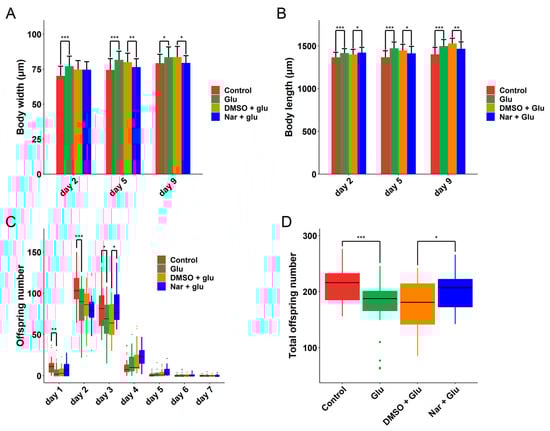 Previous studies have demonstrated that the high concentration of glucose (50 mM) in C. elegans can reduce body size and brood size of adult worms [43]. Our transcript analysis suggests that the reproduction and development of HGI C. elegans can be improved by Nar (Figure 2B). We found that the body length and width of HGI worms were significantly higher than the normal control on days 2, 5, and 9 (Figure 4A,B). Interestingly, although the body length of worms treated with Nar were longer than that of the HGI control worms on day 2, they were shorter on days 5 and 9, suggesting that the HGI worms grow faster than those with Nar treatment. Nar did reduce the decline in offspring number of the HGI worms, especially on the 3rd day (Figure 4C,D).