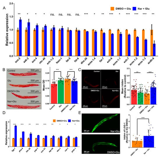 Autophagy is an evolutionarily conserved pathway to degrade and recycle cellular components [17]. It is important to the development of C. elegans and an increase in autophagy can prolong lifespan. For example, the upregulation of autophagy by astaxanthin induction can extend the lifespan of C. elegans by promoting the expression of hlh-30 or daf-16 [18]. Cannabidiol can also induce longevity by regulating genes correlated with autophagy, such as bec-1 and unc-51 [19]. In addition, autophagy can modulate lipid metabolism to extend the lifespan [20]. The suppression of ATG-9A, a C. elegans ortholog of ATG-9 in humans, which is involved in phagophore formation, can inhibit autophagy and thereby increase the size and number of lipid droplets [17,21]. Furthermore, saponin can reduce fat accumulation through autophagy pathways, such as the hlh-30 pathway, which ultimately improves health and extends lifespan [22]. A previous study has demonstrated that naringin can extend the lifespan of worms [23]. However, as a phytochemical, it is not clear whether Nar, like saponins, reduces fat deposition and promotes the autophagy pathway to alleviate glucose-induced aging and improve the corresponding phenotypes.