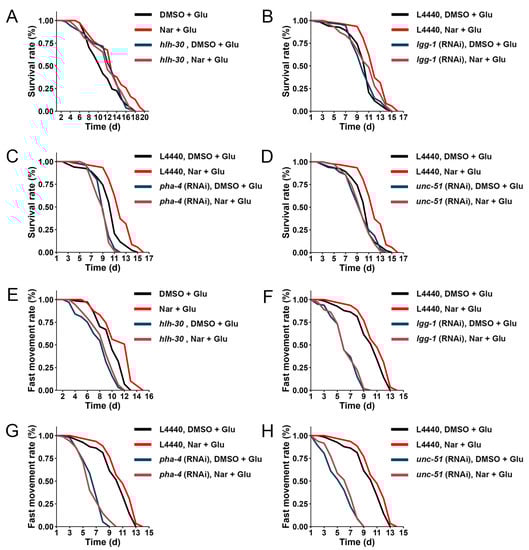 The survival and fast movement rate of hlh-30 mutants and C. elegans fed with RNAi bacteria, lgg-1, pha-4 and unc-51, in different treatments. HGI worms with or without Nar treatment did not differ in survival rate when using (A) hlh-30 mutants or when fed RNAi bacteria including (B) lgg-1, (C) pha-4 and (D) unc-51. Similarly, HGI worms with or without Nar treatment did not differ in fast movement rate when using (E) hlh-30 mutants or when fed RNAi bacteria including (F) lgg-1, (G) pha-4 and (H) unc-51. Experiments were replicated three times. Data are representative one of three independent experiments.