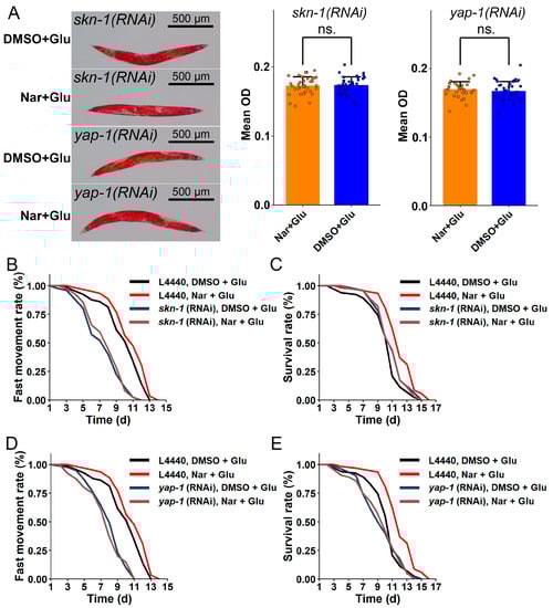 Effects of Nar on HGI worms mediated by skn-1 and yap-1. (A) Fat-lowering effect of Nar was blocked by skn-1 and yap-1 RNAi treatment in HGI worms, as observed by oil red O staining (n ≥ 33 worms per group). The experiment was replicated two times. The data are represented mean ± SD. No differences were found between HGI worms with or without Nar treatment in fast movement rates or survival rates for nematodes treated with skn-1 RNAi (B,C) and yap-1 RNAi (D,E). The experiment was replicated three times. Data are representative one of at least two independent experiments. The symbols ns. represent no significance.