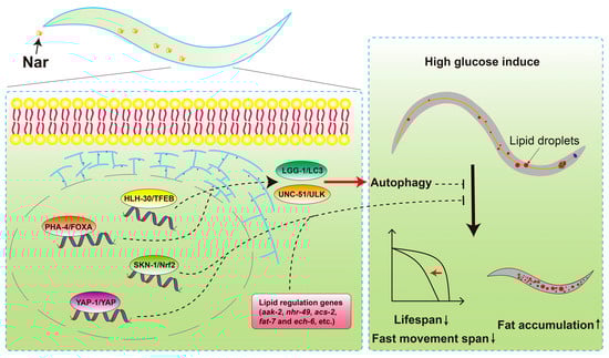 Nar has well-known health properties, including anti-inflammatory, anti-aging, and anti-oxidant properties. However, the specific mechanisms responsible remain unclear. In this study, we established the HGI C. elegans model to assess changes in aging-related phenotypes following Nar administration. Using whole transcriptome sequencing, we show significantly changed genes associated with lipid regulation and autophagy, such as in the genes skn-1, hlh-30, lgg-1, unc-51 and pha-4. Knocking out these genes led to the disappearance of fat-lowering, health-promoting and life-prolonging effects from Nar. Collectively, our findings demonstrate that Nar produces anti-obesity and anti-aging functions in HGI worms through autophagy inductions (Figure 9).