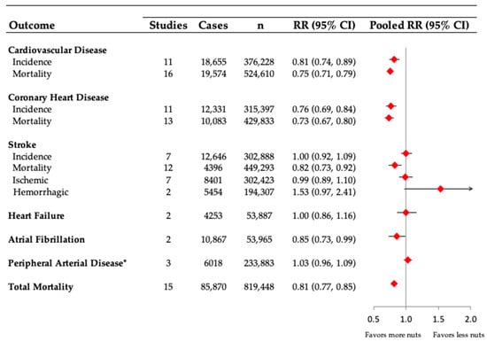 Summary of the pooled effect estimates of prospective cohort studies assessing the association between high and low consumption of nuts and risk of cardiovascular disease outcomes and total mortality. Figure adapted from Figure 2 in []. Pooled risk estimate is represented by the diamond. * To obtain summary estimates for peripheral arterial disease, we used generic inverse variance (fixed effects) to pool the natural log-transformed RRs of the extreme quantiles. Abbreviations: CI = confidence intervals; RR = relative risk.