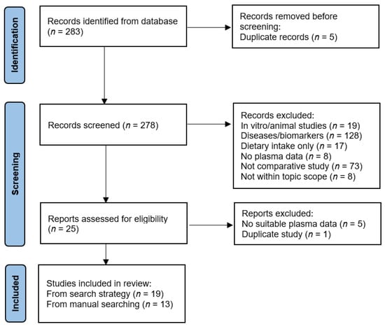 These search strategies resulted in 283 publication records that were imported into a spreadsheet for screening. Following removal of duplicates, titles and abstracts were screened and following removal of in vitro/animal studies, studies of specific diseases or related biomarkers, studies of intake only, studies with no plasma data, non-comparative studies, and out of scope studies, 25 records remained (Figure 1). Full texts were retrieved and a further 6 records were excluded due to insufficient or duplicate information, resulting in 19 publications. An additional 13 publications were identified through publication reference lists and manual database searches, totalling 32 comparative studies. The relevant data was extracted into tabular format and included: author and year, population and location of study, number and age of participants, vitamin C intake (if available) or dose administered (for pharmacokinetic studies), vitamin C status and/or prevalence of deficiency, and p-values. Vitamin C concentrations were reported as µmol/L, converted from mg/dL as required by multiplying by 56.8. The findings of these studies are summarised in the tables below with a narrative synthesis of the findings.