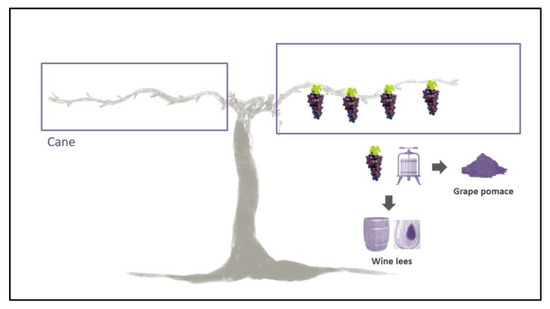 Due to the fact that besides in grapes, ε-viniferin is also present in several grapevine parts, their use to extract this bioactive compound is a very interesting issue in terms of a circular economy. Effectively, in the context of sustainability, the use of by-products is a very good strategy to reduce their environmental impact by processing them to obtain an extra benefit. The wine-growing sector generates much waste derived from agricultural practices (e.g., vine shoots, leaves and stems) and the winemaking process (e.g., grape stalks, pomace and wine lees). In particular, vine shoots, also known as grapevine canes, are the most abundant waste material. Indeed, winegrowers usually select one or two grape canes that will remain on the grapevine plant to give vigor to the grapes; thus, producing great amounts of residues. The worldwide grape cane remains, generally eliminated, are between 2 and 5 tons per hectare and year [21]. These grapevine canes have a very low economic value; in fact, they are burned or incorporated into the soil to promote the degradation of organic matter and reduce the need for organic fertilizers [22]. Consequently, obtaining ε-viniferin from these residues makes them valuable, and viticulture becomes more sustainable (Figure 2) [23,24]. Apart from plant parts, further residues derived from wine production can be used to obtain ε-viniferin, grape pomace and wine lees being the most important ones (Figure 2) [25]. Grape pomace is the primary waste generated in the winemaking process, consisting of a mixture of grape skin, seeds and stems. It has been estimated that around 30–40% of phenolic compounds remain in grape pomace after winemaking.