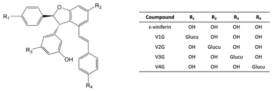 ε-viniferin is present in several plant genders, such as Vitis, Caragana, Carex, Hopea and Paonia [12,15,16,17,18] among which grapes (Vitis vinifera) are a primary source. Despite ε-viniferin is present in roots, leaves, seeds, stems and barks, the woody parts of the plants are considered the main natural sources [19]. In diet, grape berries and red wine are undoubtedly the main sources. According to the Phenol Explorer database, red wine contains both δ- and ε-viniferin at 0.64 and 0.16 mg per 100 g, respectively [20].