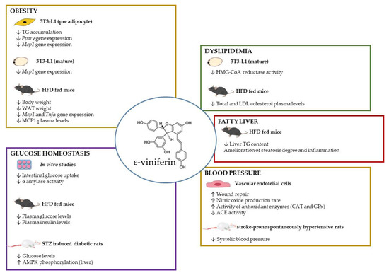 Although the published studies demonstrating the efficacy of ε-viniferin in the management of obesity and its co-morbidities are still scarce, in the present review we are interested in gathering the reported data, obtained in in vitro and in vivo studies, to show that this is an interesting molecule that seems very promising and that further research is worth it (Figure 4).