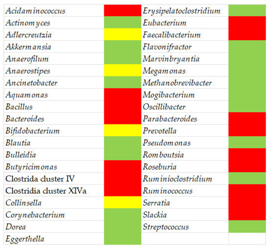 The Firmicutes phylum includes more than 200 genera, but the most representative are Clostridium, Lactobacillus, Bacillus, Enterococcus, and Ruminicoccus. In the phylum Bacteroidetes, the preponderant genera are Bacteroides and Prevotella. The phylum Actinobacteria is mainly represented by the genus Bifidobacterium [1]. Supplementary Table S1 gives some details on the composition of gut microbiota, as well as on the role of the different phyla in the host’s physiology.