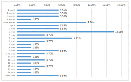 The questionnaire was completed anonymously by 55 subjects (12 males and 43 females). The first result was a higher prevalence of MS in people born in 1983. An interesting result emerged from the second question, which aimed to know how much time elapses between the onset of the disease and the medical diagnosis. The long time between the first symptoms and the medical diagnosis seems to be a real problem. In particular, 11% of volunteers had served for at least three years. This problem could be caused by incomplete diagnostic protocols, and this seems to be the first and most important problem in coping with the disease. Concerning the first diagnosis (Figure 3), 13% of interviewees reported 3 years, 7.41% reported a time up to 5 years, and 37.02% indicated more than 5 years.