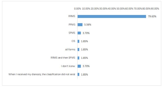 The following question was aimed at highlighting the most prevalent type of MS, and the collected answers (Figure 4) revealed a significantly higher prevalence of RR-MS (78.2%) versus all the other MS types. This result is according to the scientific literature; in fact, the most common MS type is the relapsing-remitting one, regardless of age and gender. As reported by several scientific studies, an early diagnosis should be the first tool to define and control the disease.