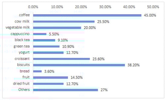 The questions numbered from four to six were aimed at collecting information on the general eating habits of the subjects (breakfast, lunch, any snacks, alcohol consumption, etc.). For example, Figure 5 shows what volunteers usually eat for breakfast; most interviewees (45%) drink coffee. Others eat biscuits (38.2%), croissants (23.6%). Healthier foods, functional for gut microbiota, are consumed by a small part of the sample; for example, only 12.7% of people usually eat yogurt.