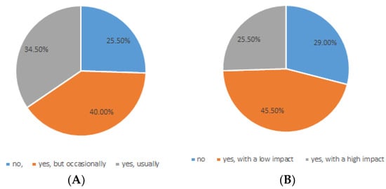 Percentage of subjects suffering from gastrointestinal symptoms. (A) Have you had gastro-intestinal symptoms? (B) Do gastro-intestinal symptoms affect your well-being?