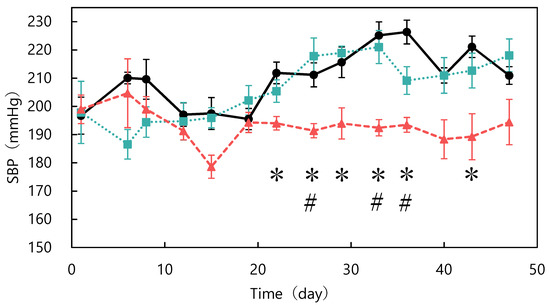 Changes in systolic blood pressure in spontaneously hypertensive rats fed different diets: control (●), unfermented (■), and fermented (▲). * p < 0.05 fermented vs. control group; # p < 0.05 fermented vs. unfermented group. The data represented the mean values ± standard error (n = 6).