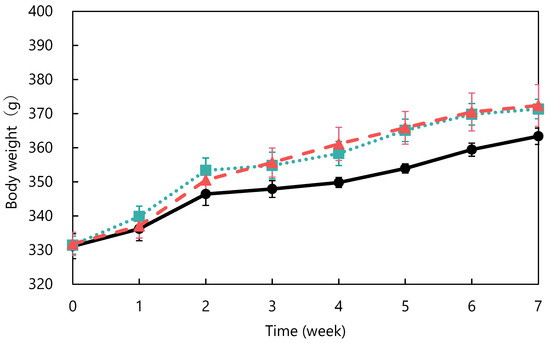 Changes in body weight in spontaneously hypertensive rats: control (●), unfermented (■) and fermented (▲). The data represented the mean values ± standard error (n = 6).