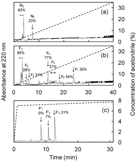Separation of <3 kDa fraction of fermented and unfermented abalone viscera by RP-HPLC. (a) Chromatogram of unfermented abalone viscera, (b) chromatogram of fermented abalone viscera, (c) chromatogram of fraction F4. The percentage of ACE inhibition for each peak is indicated next to the symbol.