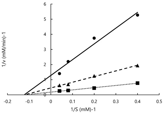 The mode of inhibition was determined using Lineweaver–Burk plots [19,24]. Briefly, 50 μL of L-m-tyrosine (0, 0.28, and 0.57 mM) and 100 μL of ACE (10 mU/mL) were mixed and incubated at 37 °C for 10 min. After incubation, 25 μL of Hip-His-Leu (2.5, 5.0, 12.5, and 25 mM) was added, and the mixture was incubated at 37 °C for 40 min. Then, 50 μL of 1N NaOH was added, and after the reaction was stopped, 10 μL of 0.2% o-phthalaldehyde solution was added, and the reaction was carried out at room temperature for 15 min under light-shielding conditions. Then, 15 μL of 3.6 M phosphoric acid solution was added, and fluorescence intensity was measured at excitation and emission wavelengths of 360 and 460 nm, respectively. The Michaelis–Menten constant (Km) and the maximum reaction rate (Vmax) were calculated according to the Michaelis–Menten kinetic equation from the Lineweaver–Burk plot.